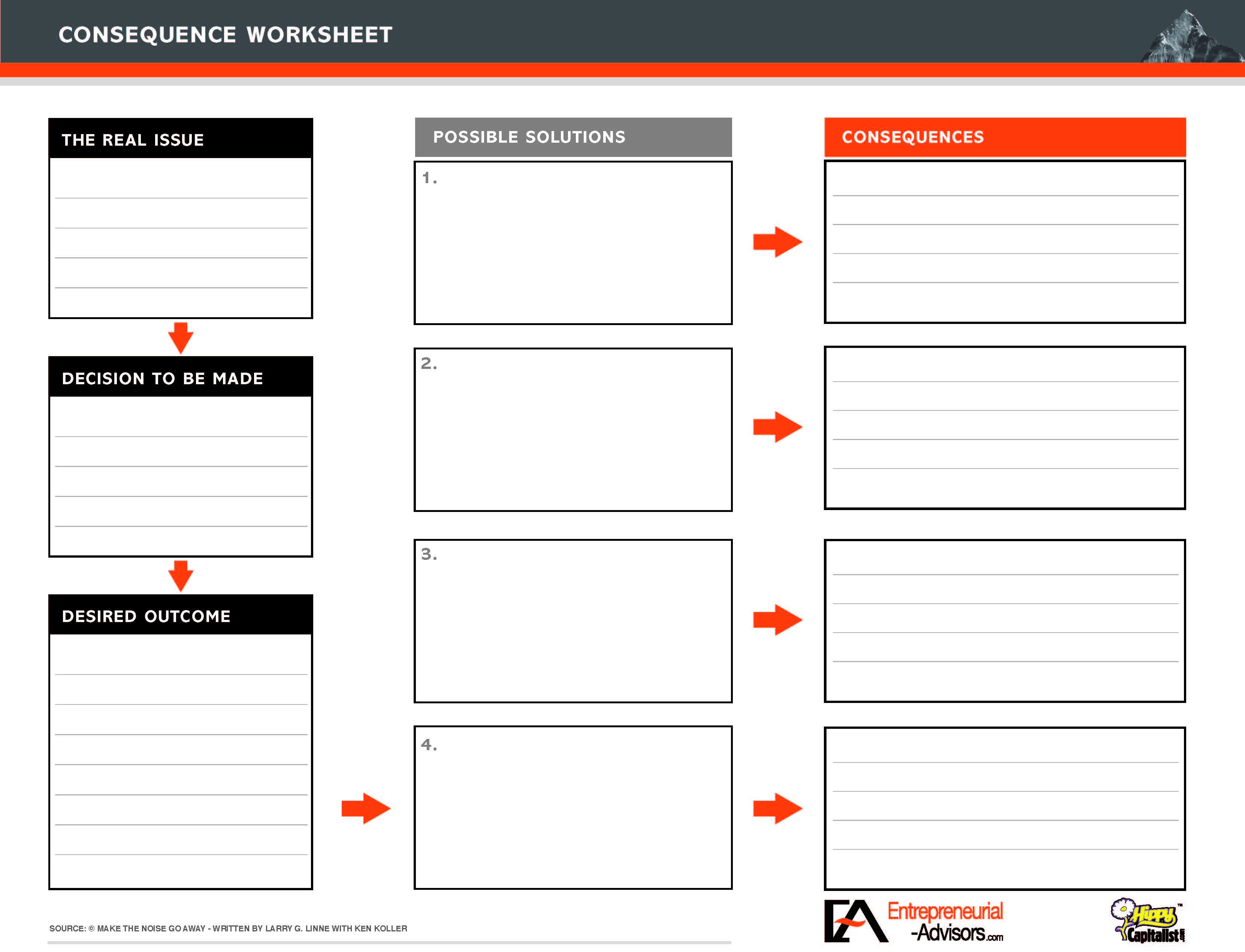 This tool helps to teach both direct reports and senior leaders. For the senior leader, it provides comfort in knowing that the main concerns are being identified. It also assists senior leaders with seeing how the direct report is thinking and that they are considering multiple options. For the direct report, this tool is a forcing device to work on clarifying the true issue, exploring a variety of ways to resolve that issue, and determining the related consequences associated with each possible direction. At this point, with a completed worksheet, it becomes much easier for the senior leader to coach and trust.